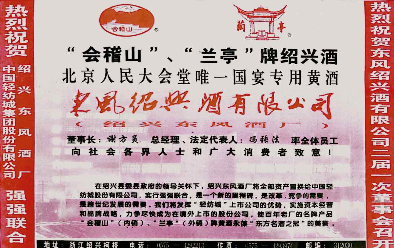 1998年,會稽山·蘭亭成為人民大會堂唯一制定黃酒:國宴用菜一直是淮揚菜,這也是當(dāng)年周總理定下來的,主要是考慮到淮揚菜口味適中,比較容易被各地、各個國家的人接受,而口味適中的淮揚菜最適合配較為低度、同樣口感較為適中的黃酒,于是在身為江蘇揚州人的江澤民總書記的指定下,會稽山蘭亭被人民大會堂指定為國宴專用黃酒。