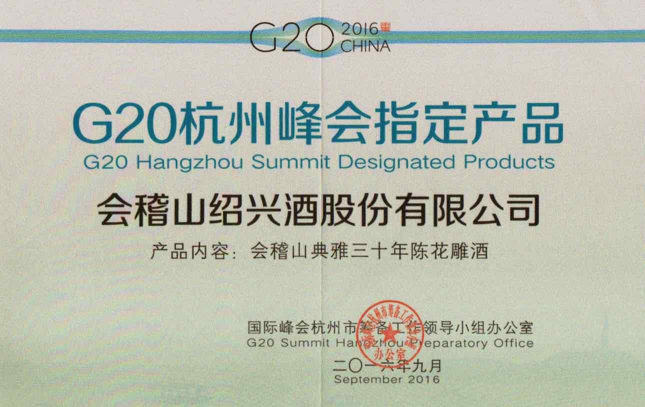 2016年,G20杭州峰會接待專用黃酒。這與蘭亭成為當(dāng)時的國宴用酒有異曲同工之妙(口味口感更適中),更因為習(xí)書記在浙江任職多年,對于黃酒有很深的了解,同時,在中國文化復(fù)興的時候,用黃酒這樣的本土酒來作為G20峰會,更能代表中國。