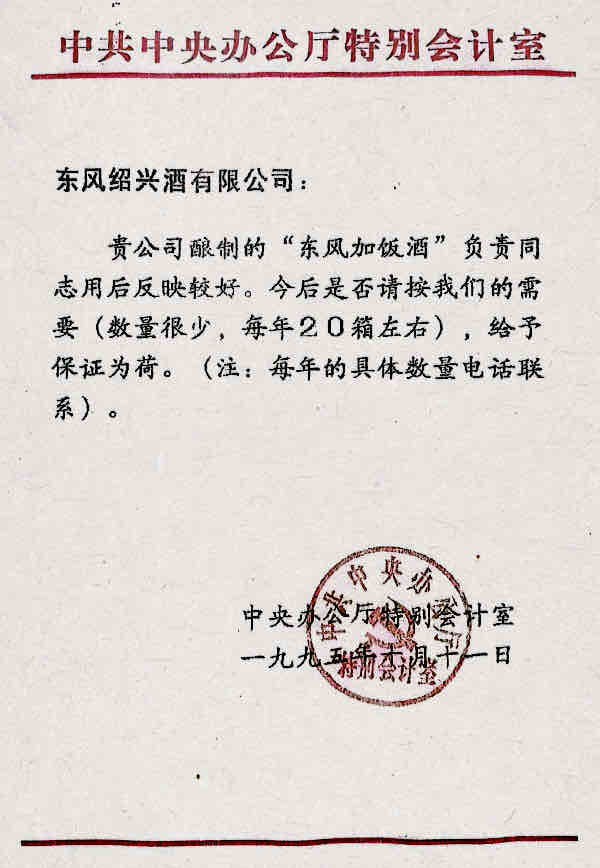 1949年開國大典晚宴,周恩來總理親筆批示使用紹興黃酒作為開國用酒:當(dāng)時茅臺尚未建廠,還只是赤水河邊的有待整合的若干小作坊。在那個年代,黃酒比白酒更金貴,各類生活物資尤其是糧食格外緊缺,只有會稽山前身云集酒廠等極少數(shù)酒廠還能有糯米釀酒,為了表示國宴的重要性,周恩來特地從紹興緊急調(diào)撥了一批陳年紹興黃酒,這些酒也成了蘭亭酒的“樣品酒”。